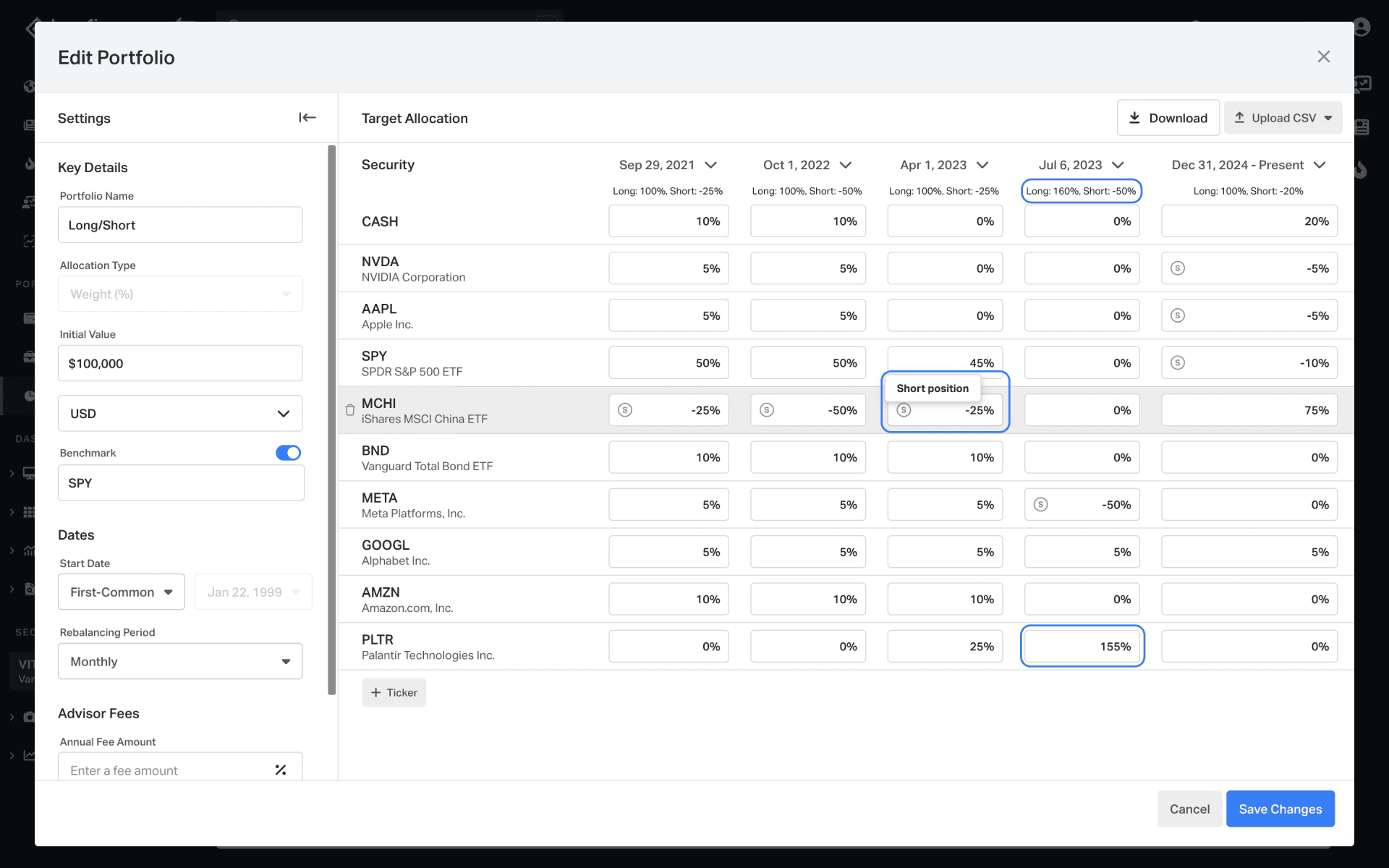 Koyfin support for long/short and leveraged portfolios