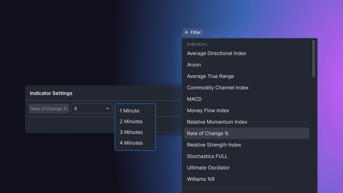 In addition to time frame flexibility, you now have access to an extensive library of technical indicators with customizable parameters (e.g., RSI periods, moving average length) so you can fine-tune the results to suit your system. Key indicators include: