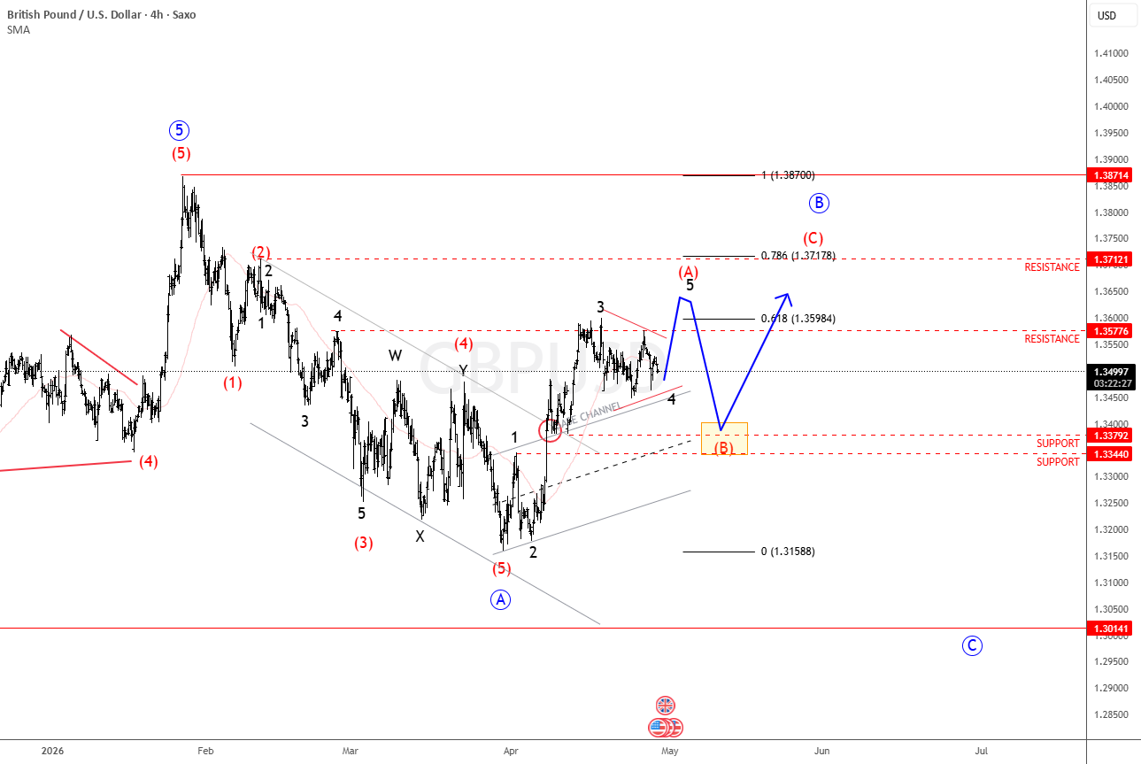 From an Elliott wave perspective, the pair appears to be developing a triple recovery within wave B (blue). The current upward move is likely to be part of sub-wave A, which may extend beyond the 1.3600 area. Even a move within that zone will still represent only the first phase of a broader corrective structure.