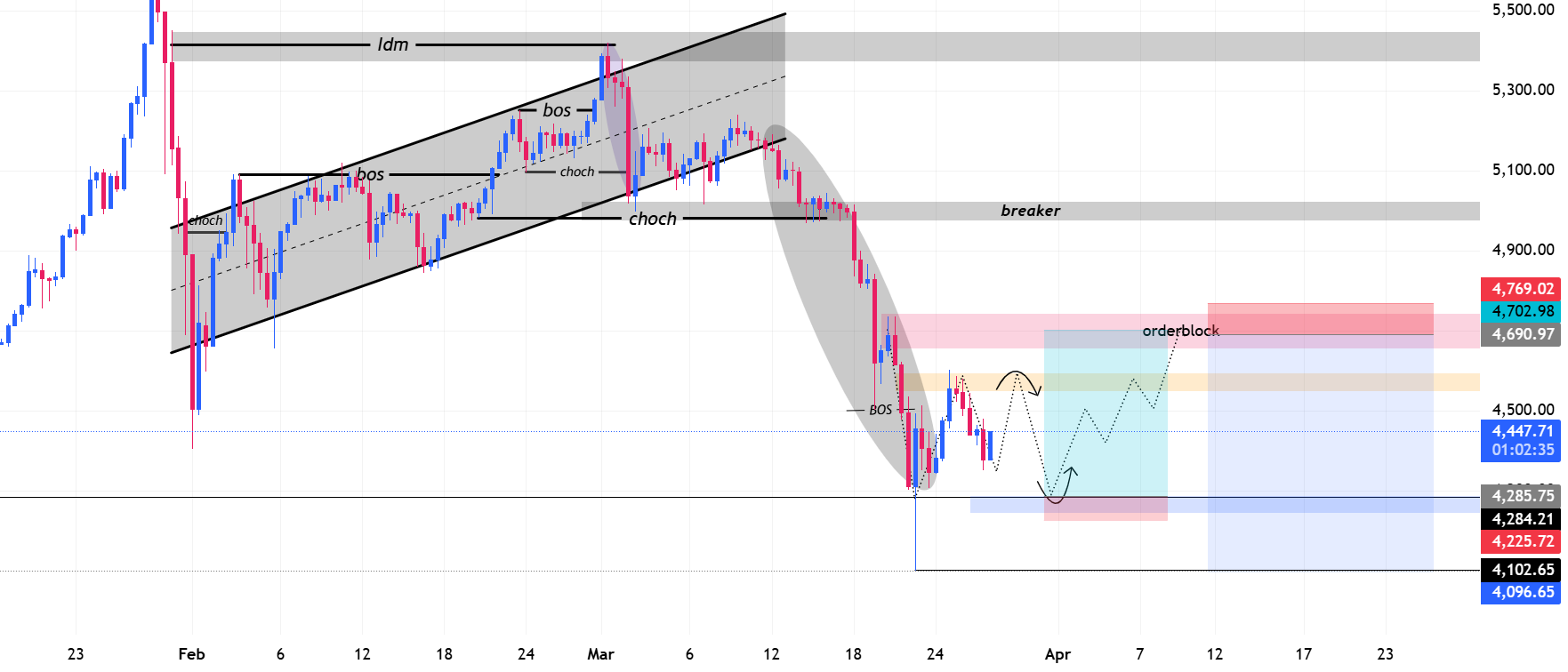 Strong bearish BOS followed by corrective pullback (possibly liquidity grab before continuation).
