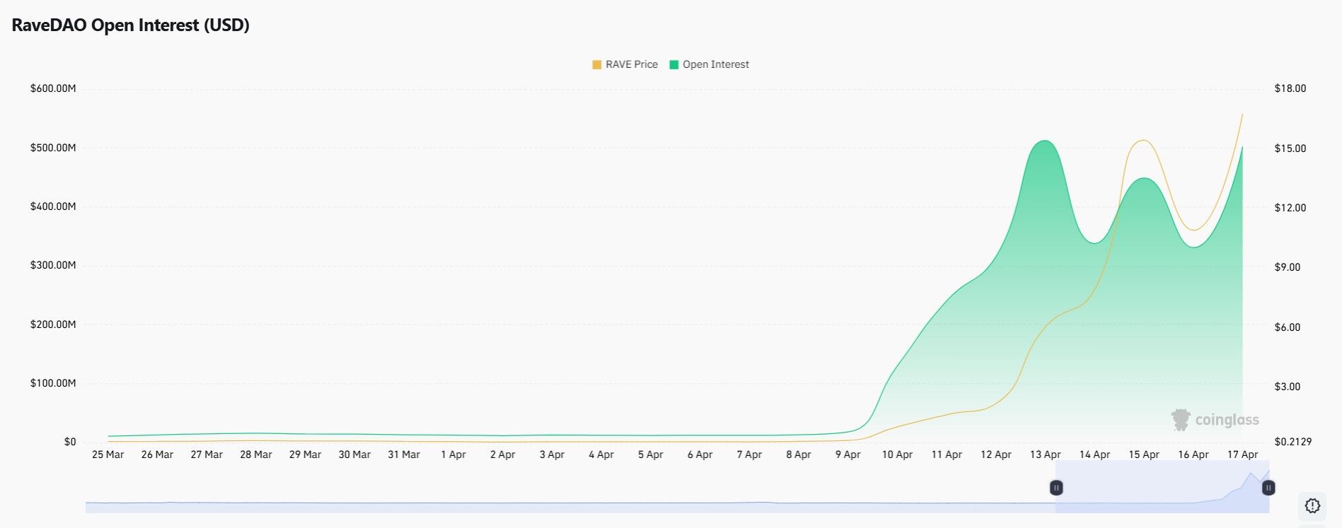 Rave DAO Open interest rose from almost zero on April 9 to a peak of $510 million on April 13. Coinglass data shows that the explosive buildup has since split into two lower highs.