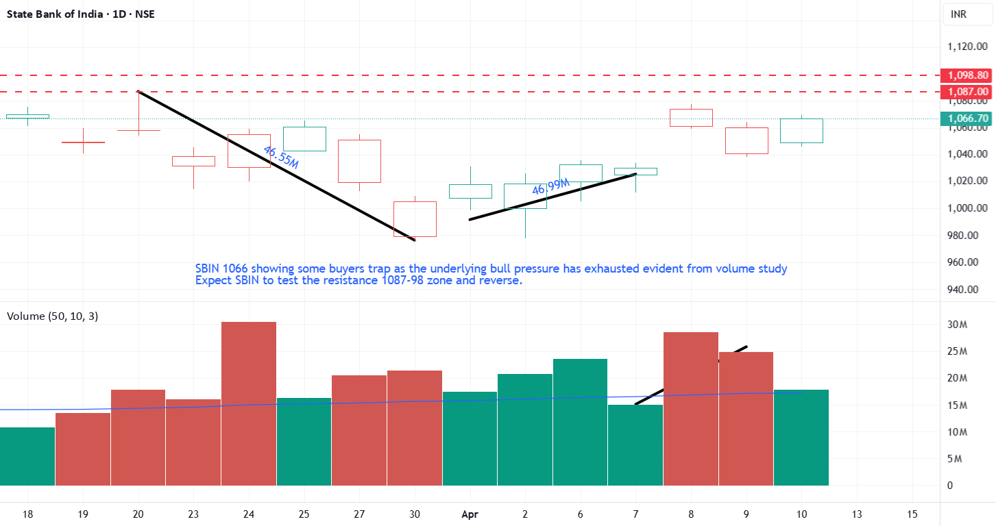 SBIN 1066 shows some buyers trap as underlying bullish pressure has clearly exhausted from volume study.