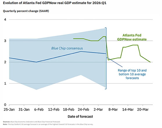 The Atlanta Fed has already lowered its first-quarter GDP estimate to an annualized pace of 2.0%, down from 2.8% on March 18 and 3.2% on March 5.